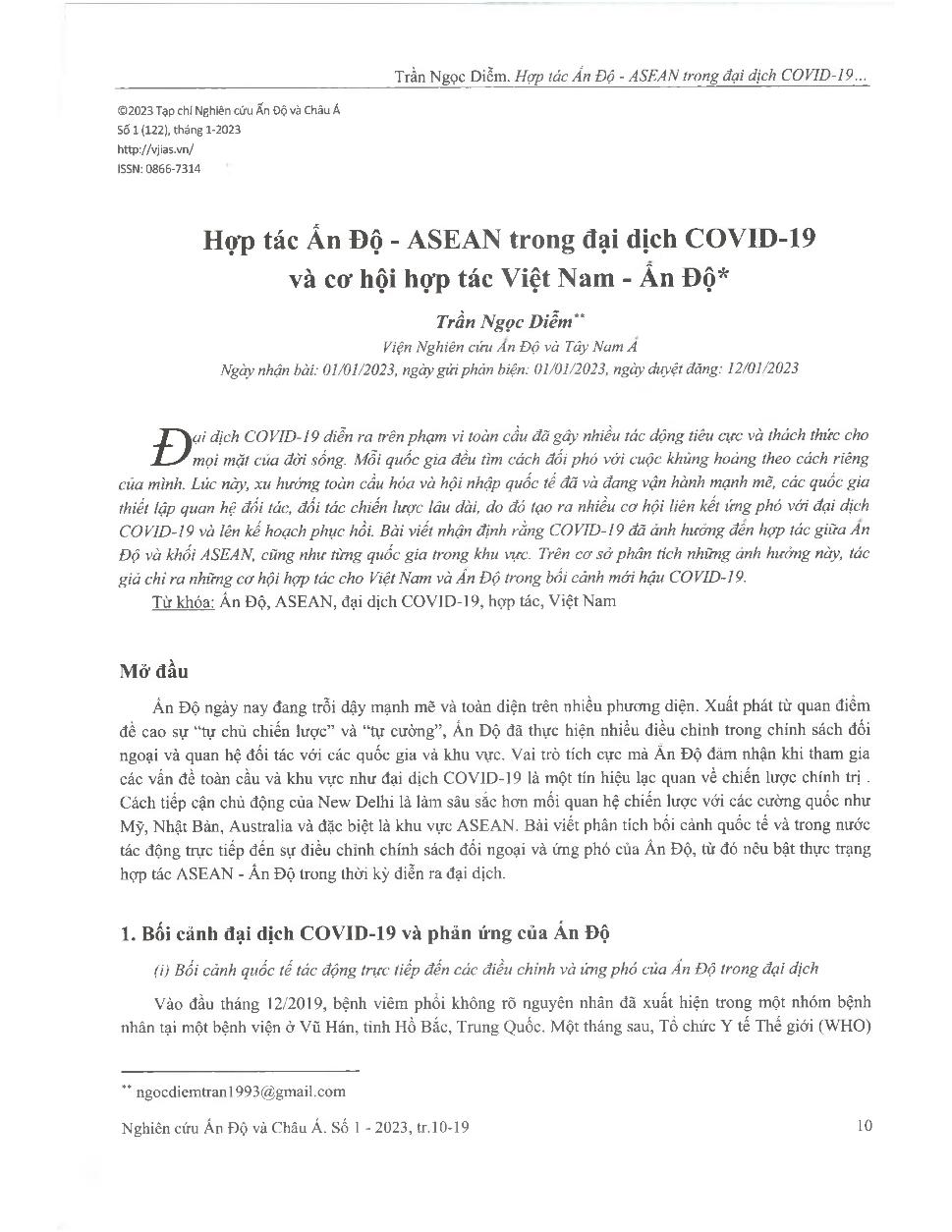 Hợp tác Ấn Độ - ASEAN trong đại dịch COVID-19 và cơ hội hợp tác Việt Nam - Ấn Độ = India - ASEAN cooperation during the COVID-19 pandemic and opportunities for Vietnam - India cooperation