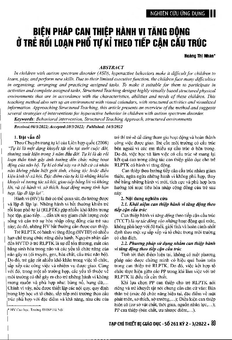 Biện pháp can thiệp hành vi tăng động ở trẻ rối loạn phổ tự kỷ theo tiếp cận cấu trúc = Measure of intervening hyperactive behavior in children with autism spectrum disorder according to structural approach