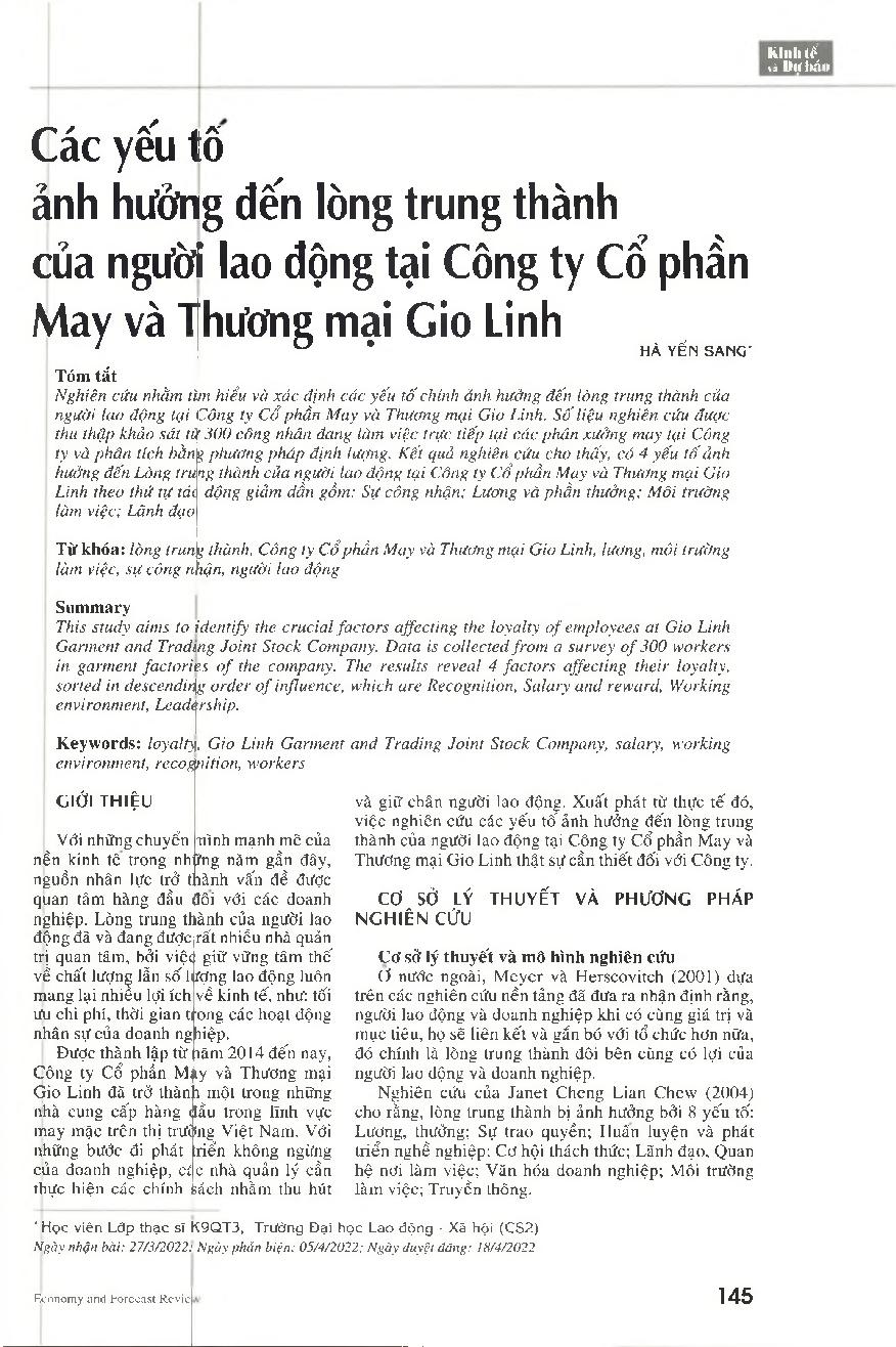 Các yếu tố ảnh hưởng đến lòng trung thành của người lao động tại Công ty cổ phần May và Thương mại Gio Linh = Factors affecting the loyalty of employees at Gio Linh Garment and Trading Joint Stock Company