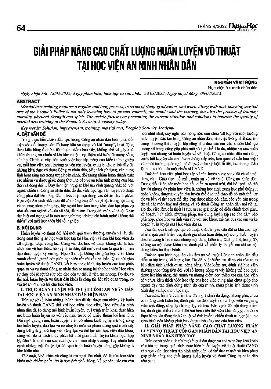 Giải pháp nàng cao chất lượng huấn luyện võ thuật tại Học viện An ninh nhân dân = Solutions to improve the quality of martial arts training of the People s Police at the People&; 39;s Security Academy