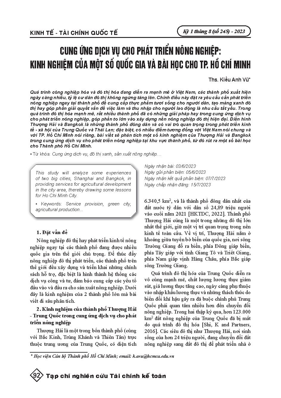 Cung ứng dịch vụ cho phát triển nông nghiệp: Kinh nghiệm của một số quốc gia và bài học cho TP. Hồ Chí Minh = Supplying services for agricultural development: experiences from certain countries and lessons for Ho Chi Minh City