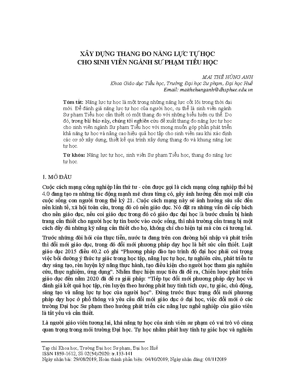 Xây dựng thang đo năng lực tự học cho sinh viên ngành sư phạm tiểu học = Building the scale to assess prospective primary teachers’ self-directed learning capacity