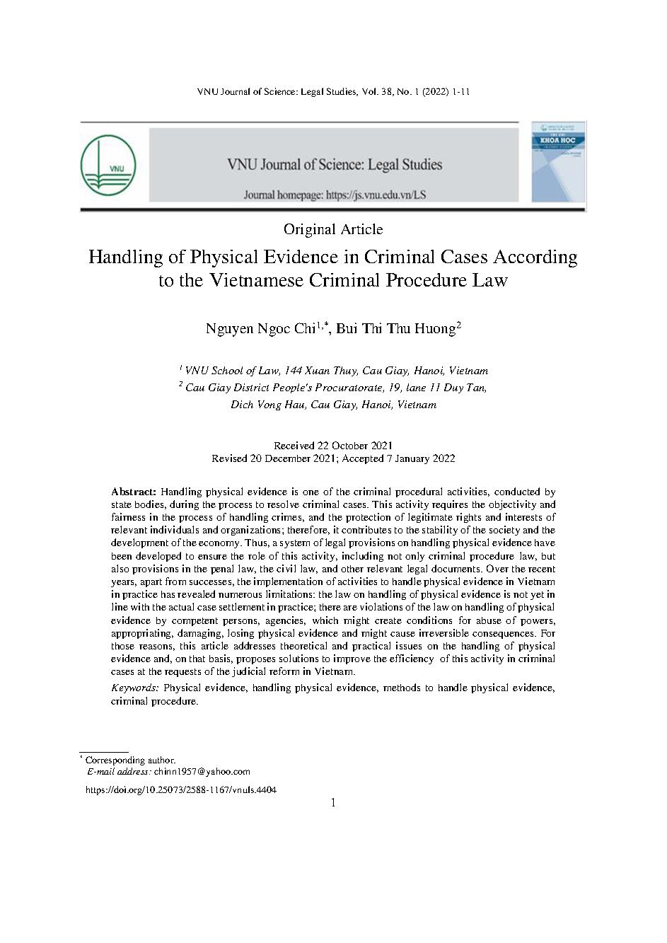 Xử lý vật chứng trong quá trình giải quyết vụ án theo luật tố tụng hình sự Việt Nam = Handling of physical evidence in criminal cases according to the Vietnamese criminal procedure law