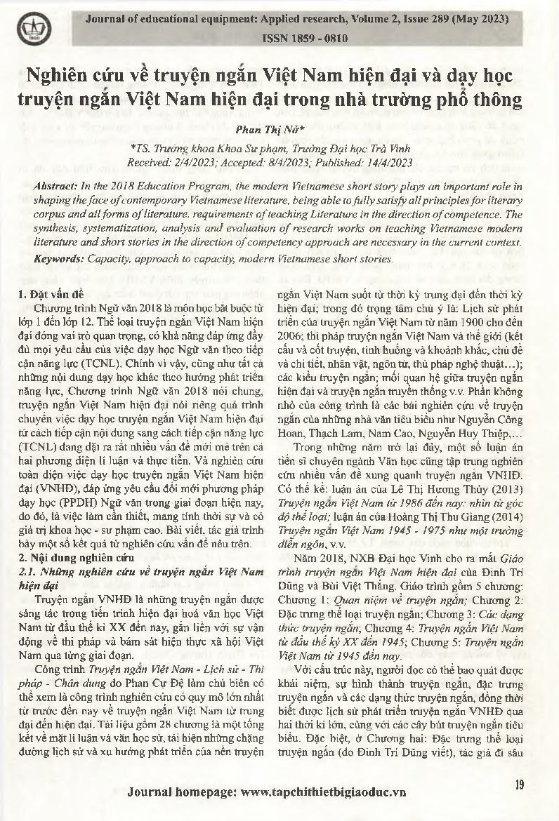 Nghiên cứu về truyện ngắn Việt Nam hiện đại và dạy học truyện ngắn Việt Nam hiện đại trong nhà trường phổ thông = Studying modern Vietnamese short stories and teaching modern Vietnamese short stories in high schools