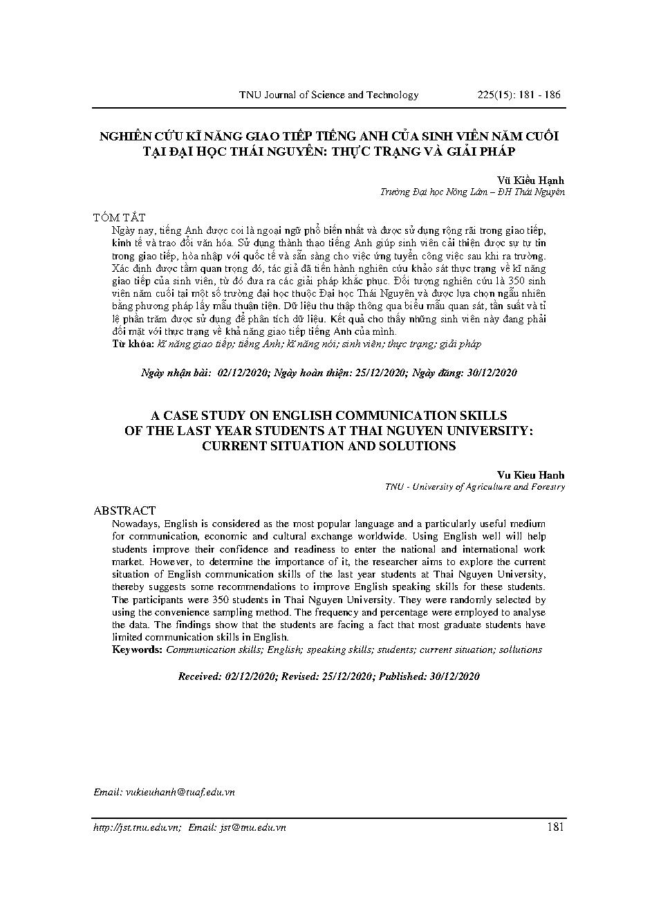Nghiên cứu kĩ năng giao tiếp tiếng Anh của sinh viên năm cuối tại Đại học Thái Nguyên: Thực trạng và giải pháp = A case study on english communication skills of the last year students at Thai Nguyen university: Current situation and solutions