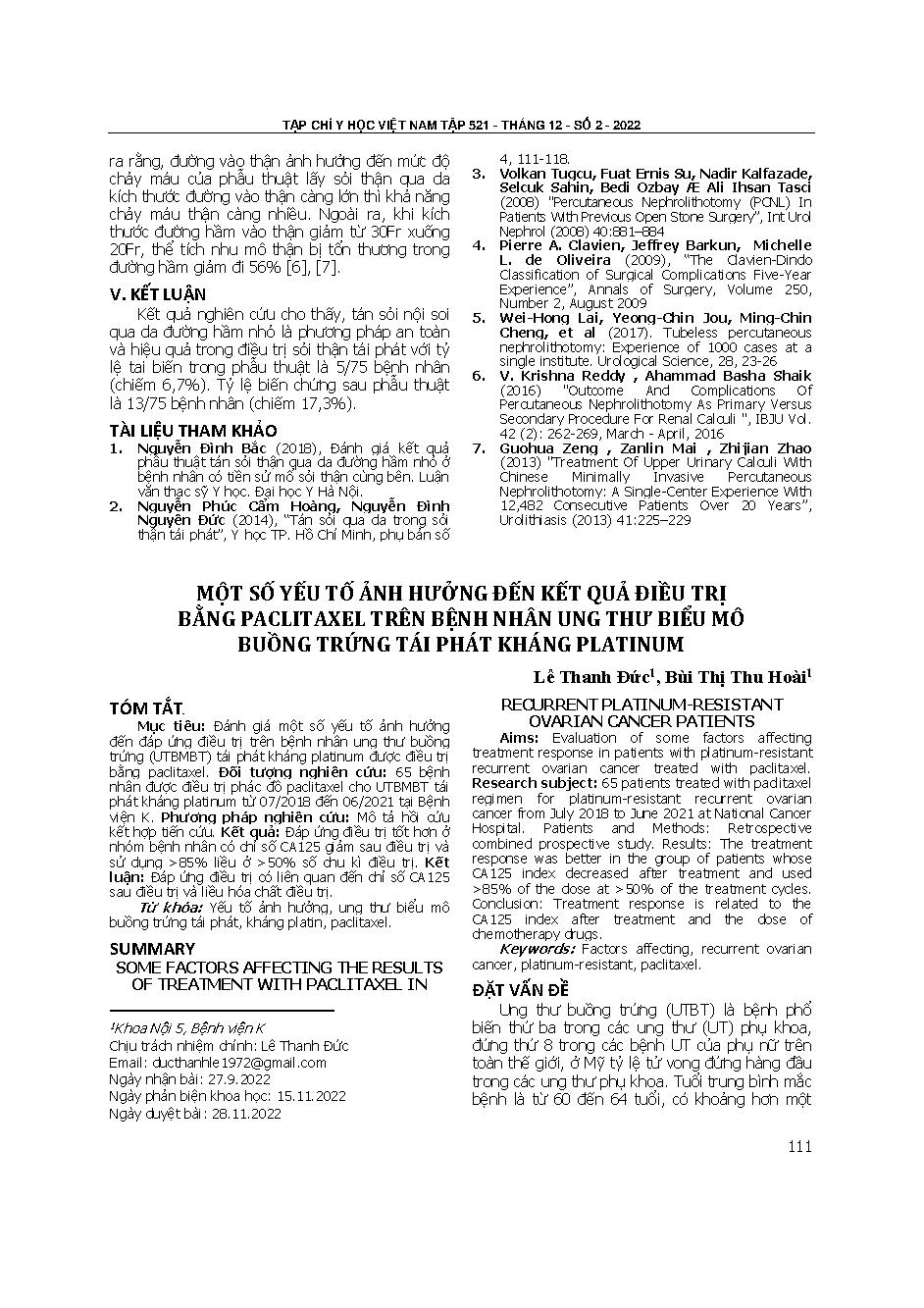 Một số yếu tố ảnh hưởng đến kết quả điều trị bằng paclitaxel trên bệnh nhân ung thư biểu mô buồng trứng tái phát kháng platinum = Some factors affecting the results of treatment with paclitaxel in recurrent platinum-resistant ovarian cancer patients