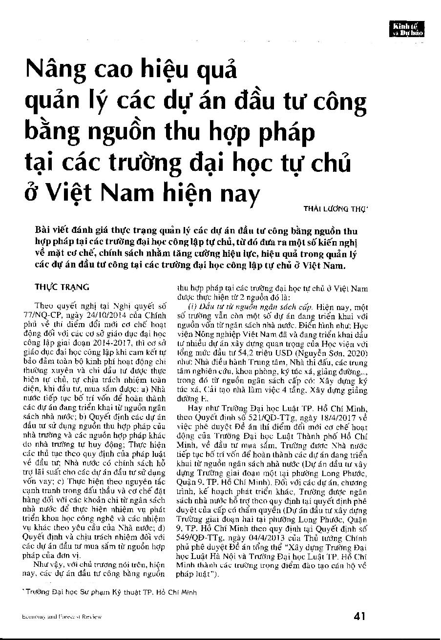 Nâng cao hiệu quả quản lý các dự án đầu tư công bằng nguồn thu hợp pháp tại các trường đại học tự chủ ở Việt Nam hiện nay