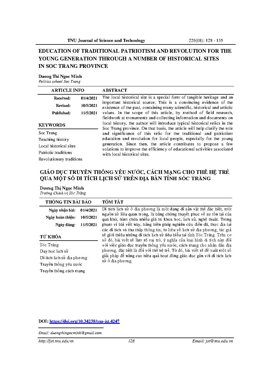 Giáo dục truyền thống yêu nước, cách mạng cho thế hệ trẻ qua một số di tích lịch sử trên địa bàn tỉnh Sóc Trăng = Education of traditional patriotism and revolution for the young generation through a number of historical sites in soc trang province