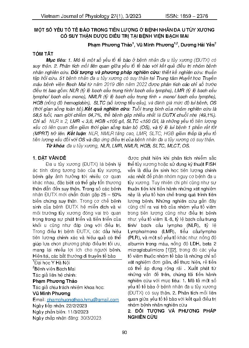 Một số yếu tố tế bào trong tiên lượng ở bệnh nhân đa u tủy xương có suy thận được điều trị tại Bệnh viện Bạch Mai = Some immune system cells factors in the prognosis of multiple myeloma patients with renal failure treated at Bach Mai hospital