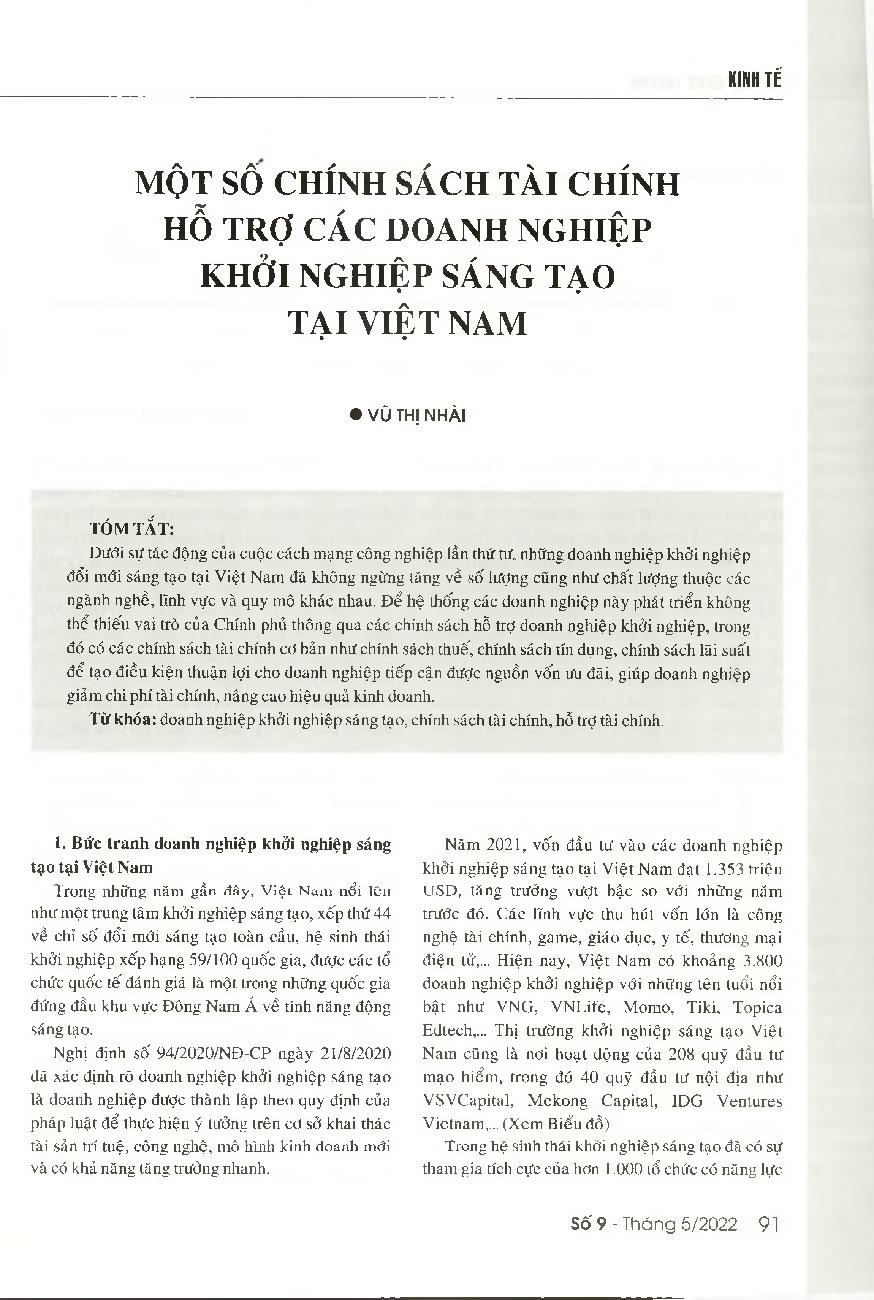 Một số chính sách tài chính hỗ trợ các doanh nghiệp khởi nghiệp sáng tạo tại Việt Nam = Some financial policies to support innovative start-ups in Vietnam