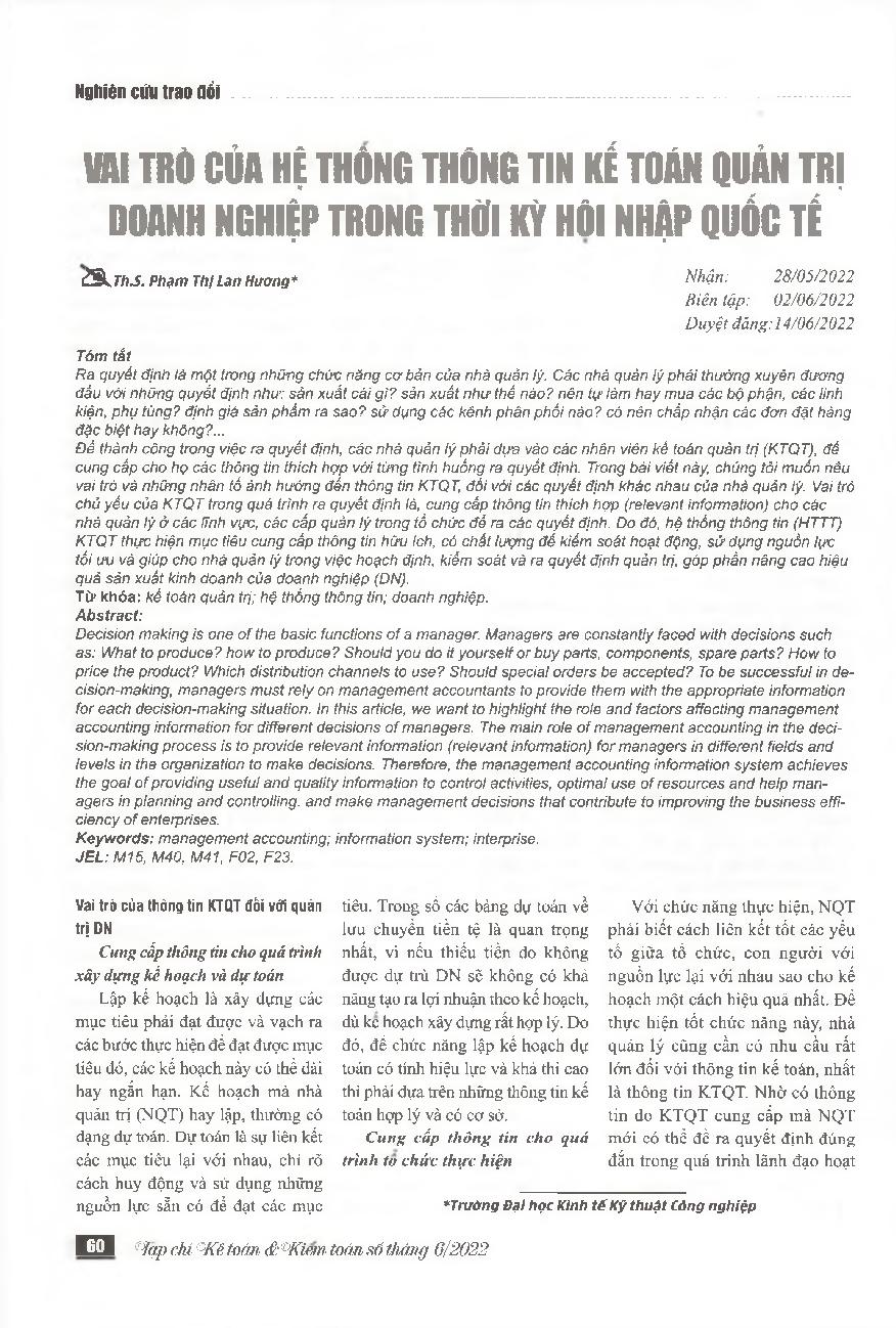 Vai trò của hệ thống thông tin kế toán quản trị doanh nghiệp trong thời kỳ hội nhập quốc tế = The role of accounting information system in international economy