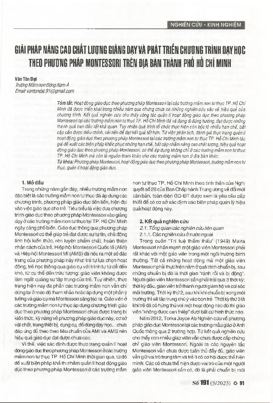 Giải pháp nâng cao chất lượng giảng dạy và phát triển chương trình dạy học theo phương pháp Montessori trên địa bàn TP. Hồ Chí Minh = Solutions to improve the teaching quality and develop the teaching programs following Montessori method are widely dissem