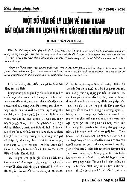 Một số vấn đề lý luận về kinh doanh bất động sản su lịch và yêu cầu điều chỉnh pháp luật = Some theoretical issues about real estate business and require legal regulation
