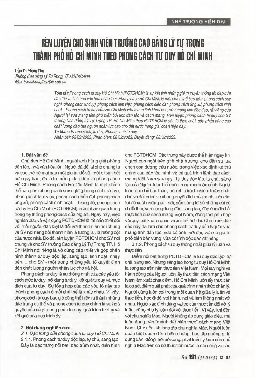 Rèn luyện cho sinh viên Trường Cao đẳng Lý Tự Trọng TP. Hồ Chí Minh theo phong cách tư duy Hồ Chí Minh = Training the students of Ly Tu Trong College in Ho Chi Minh City according to Ho Chi Minh's thinking style.