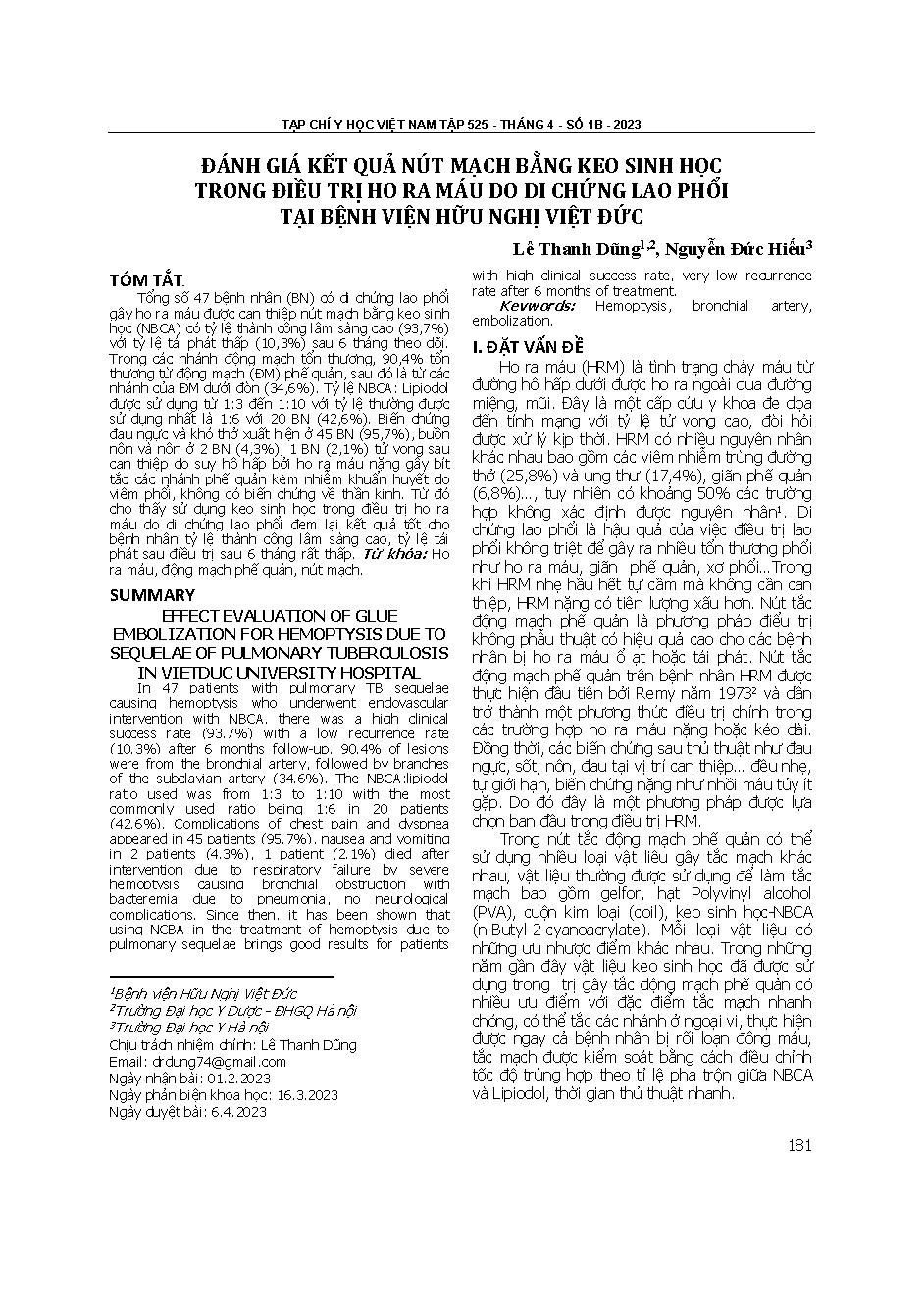 Đánh giá kết quả nút mạch bằng keo sinh học trong điều trị ho ra máu do di chứng lao phổi tại Bệnh viện Hữu nghị Việt Đức = Effect evaluation of glue embolization for hemoptysis due to sequelae of pulmonary tuberculosis in Viet Duc university hospital