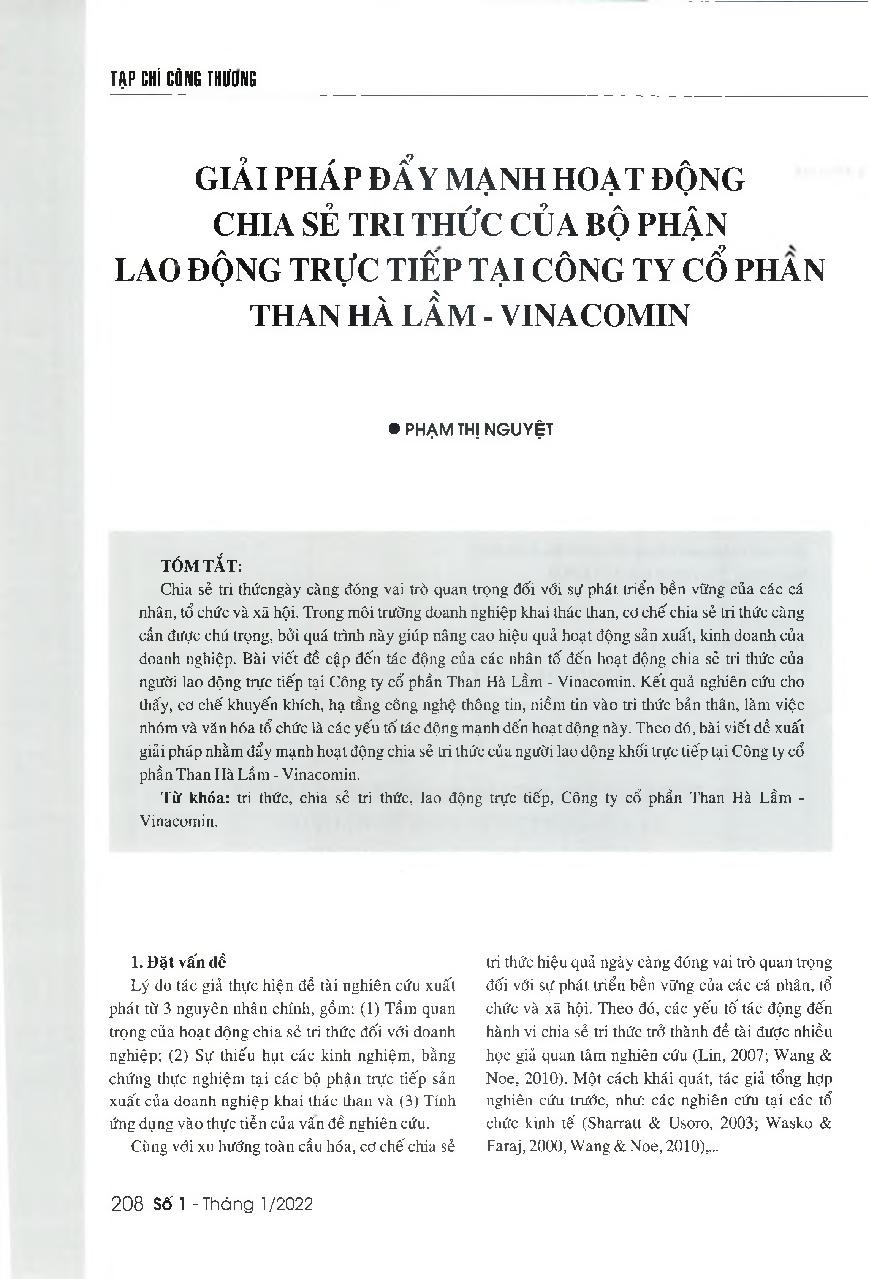 Giải pháp đẩy mạnh hoạt động chia sè tri thức của bộ phận lao động trực tiếp tại Công ty cổ phần Than Hà Lầm - Vinacomin = Solutions to promote the knowledge sharing of direct employees at Vinacomin - Ha Lam Coal Joint stock Company