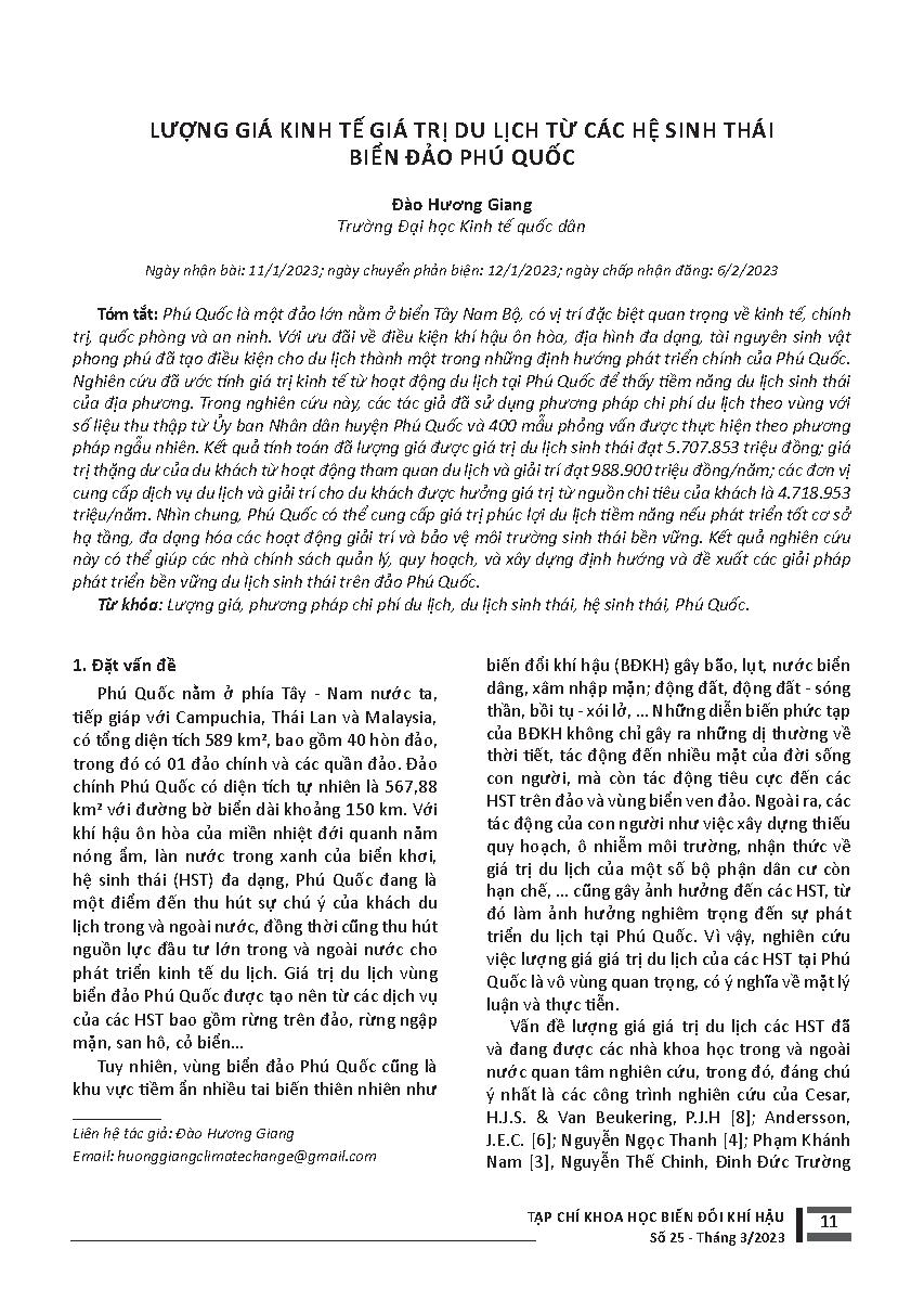 Lượng giá kinh tế giá trị du lịch từ các hệ sinh thái biển đảo Phú Quốc = Economic valuaon of tourism for typical ecosystems in Phu Quoc