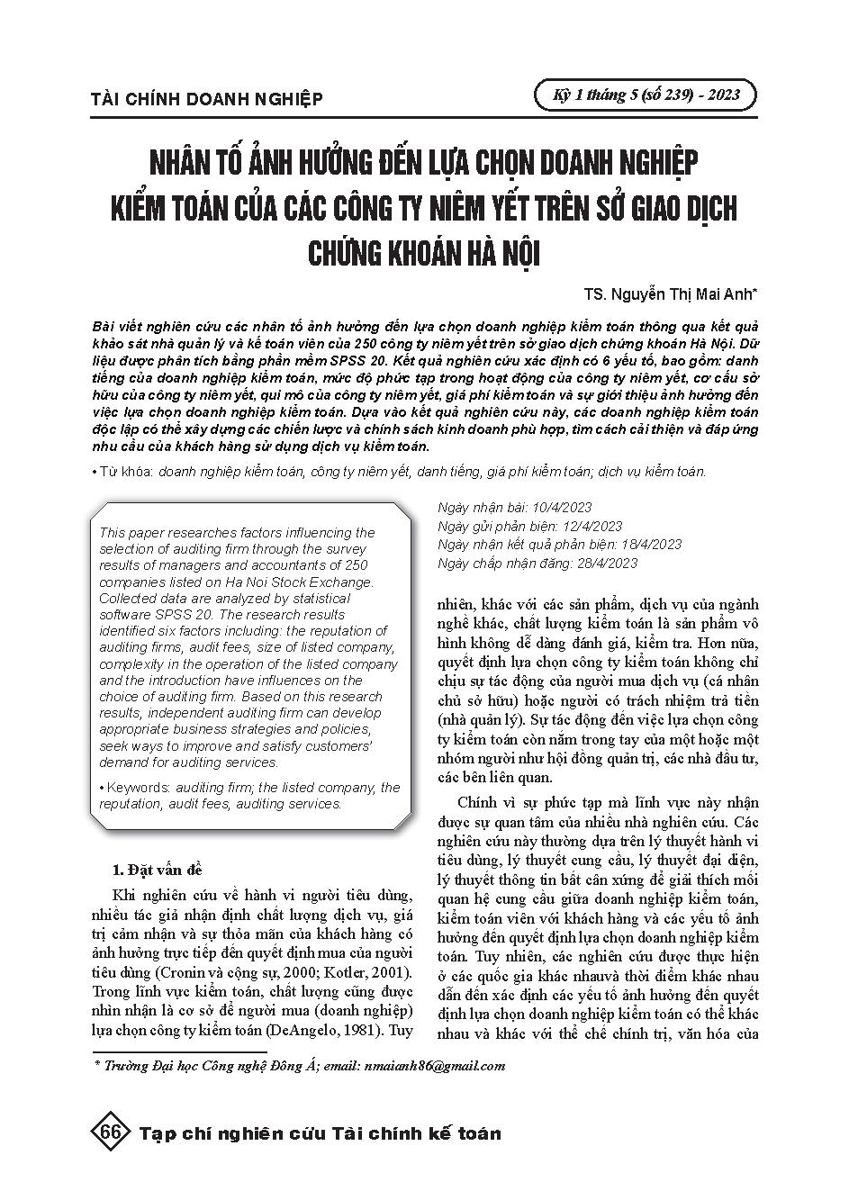 Nhân tố ảnh hưởng đến lựa chọn doanh nghiệp kiểm toán của các công ty niêm yết trên sở giao dịch chứng khoán Hà Nội = Factors affecting the choice of auditing firms of companies listed on the Hanoi Stock Exchange