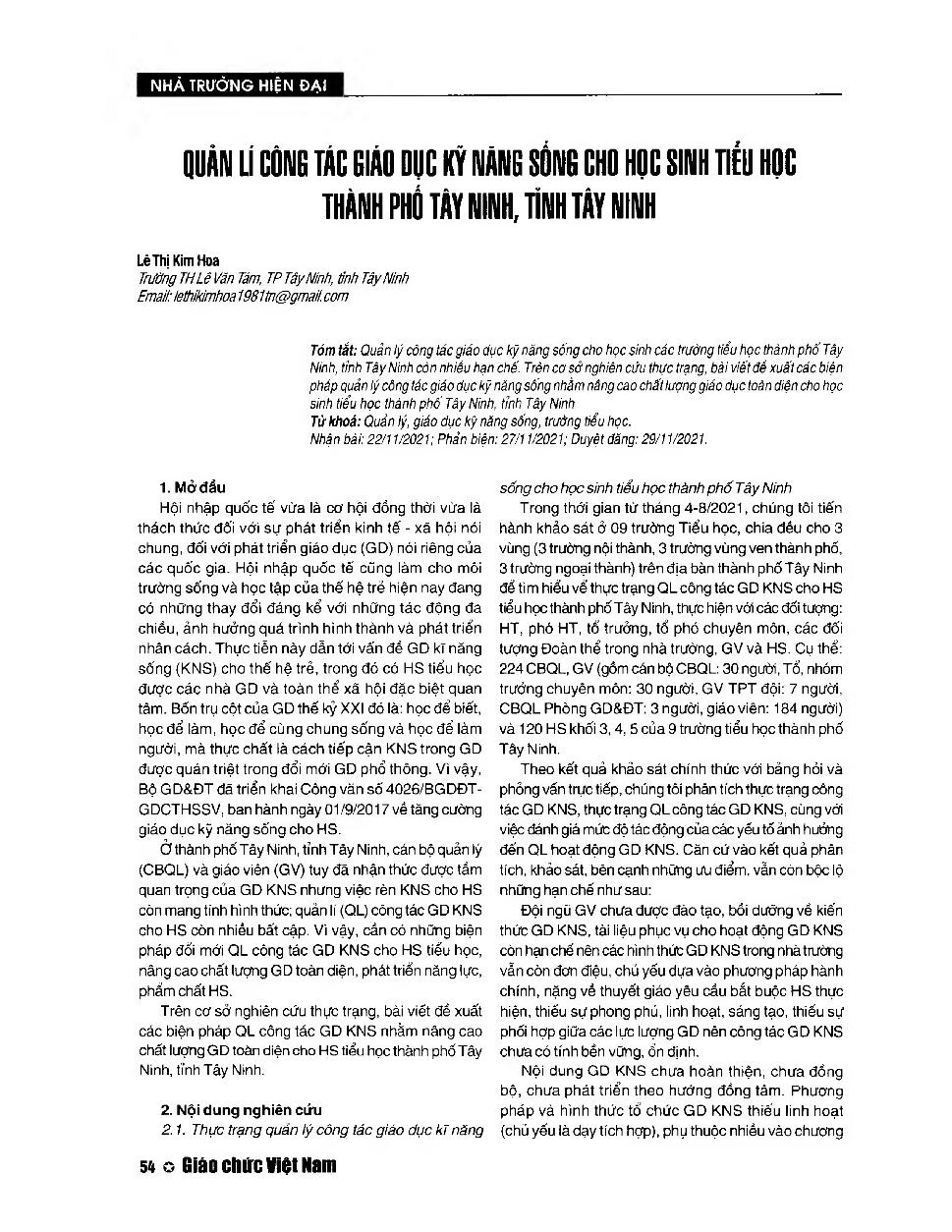 Quản lý công tác giáo dục kỹ năng sống cho học sinh tiểu học thành phố Tây Ninh, tỉnh Tây Ninh = Managing life skills education for primary school students in Tay Ninh city, Tay Ninh province