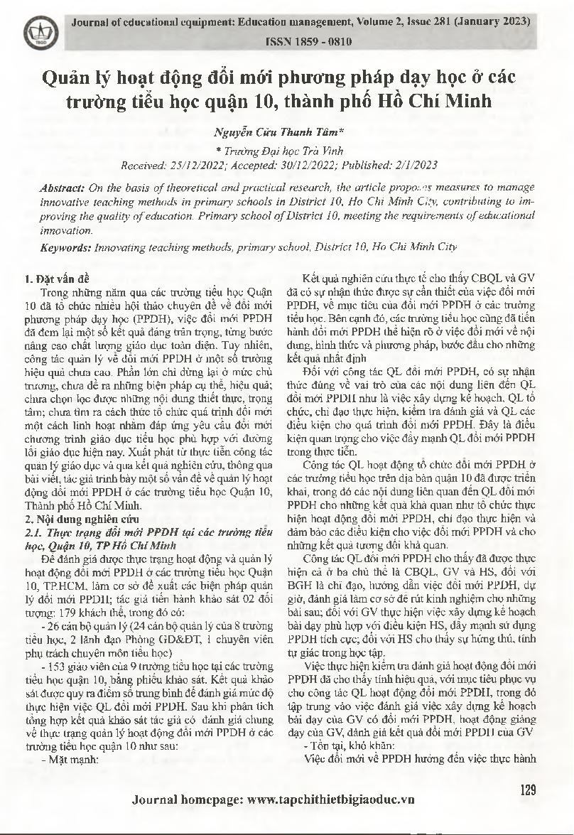 Thực trạng quản lí hoạt động phối hợp giáo dục đạo đức học sinh giữa giáo viên chủ nhiệm và cha mẹ học sinh tại các trường trung học cơ sở ở thành phố Tân An, tỉnh Long An = The current situation of management of collaboration for moral education between