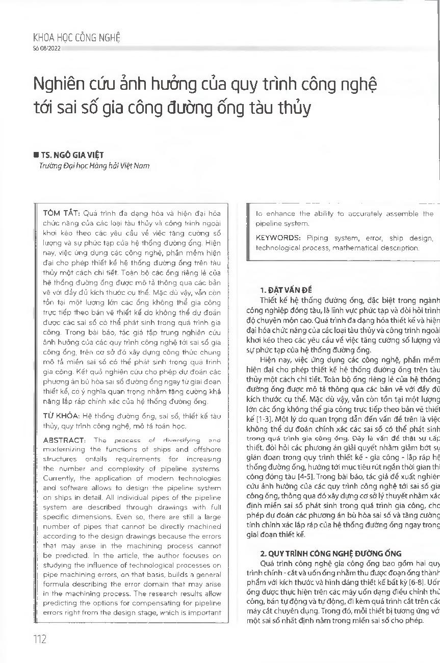 Nghiên cứu ảnh hưởng của quy trình công nghệ tới sai số gia công đường ống tàu thủy = Study on the influence of technological processes on the manufacturing error of ship pipelines