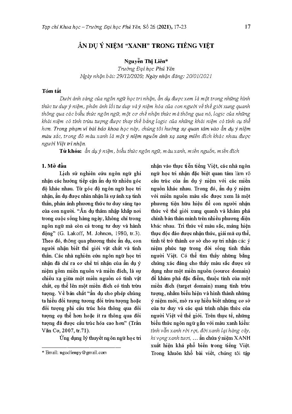 Ẩn dụ ý niệm “xanh” trong tiếng Việt = Conceptual metaphor of the blue in the Vietnamese language