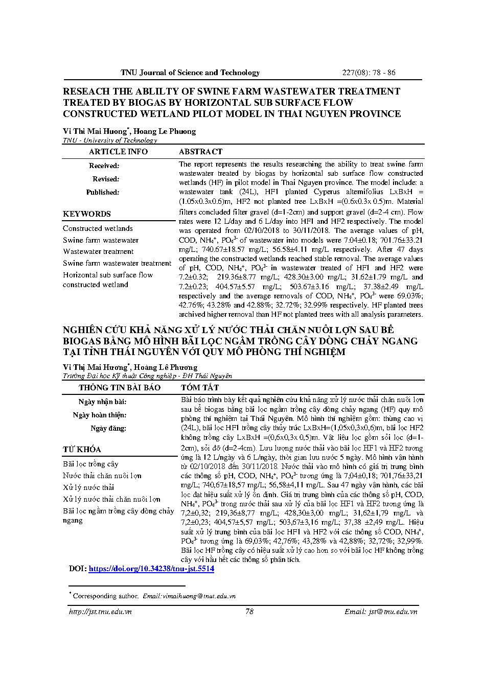 Nghiên cứu khả năng xử lý nước thải chăn nuôi lợn sau bể biogas bằng mô hình bãi lọc ngầm trồng cây dòng chảy ngang tại tỉnh Thái Nguyên với quy mô phòng thí nghiệm = Reseach the ablilty of swine farm wastewater treatment treated by biogas by horizontal s