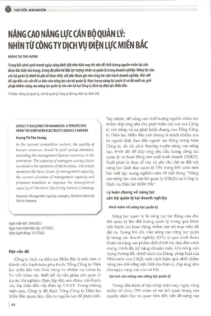 Nâng cao năng lực cán bộ quản lý: Nhìn từ Công ty Dịch vụ điện lực miền Bắc = Capacity building for managers: A perspective from the Northern Electricity Service Company