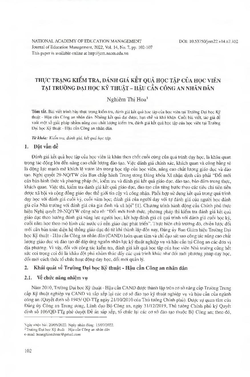 Thực trạng kiểm tra, đánh giá kết quả học tập của học viên tại Trường Đại học Kỹ thuật - Hậu cần Công an nhân dân = The situation of testing and assessment of students’ study performance at People’s Technology and Logistic University