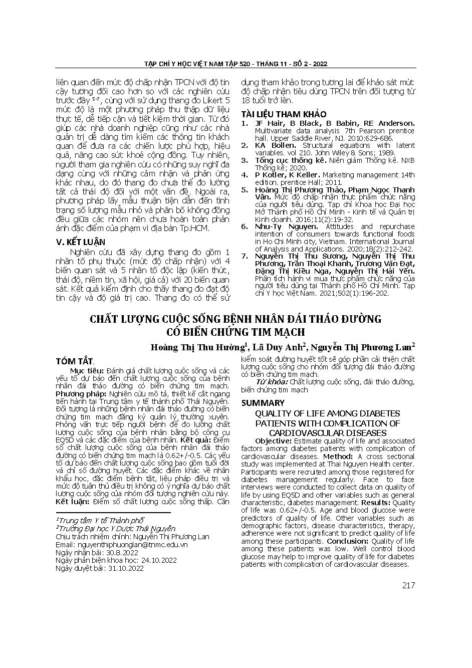 Chất lượng cuộc sống bệnh nhân đái tháo đường có biến chứng tim mạch = Quality of life among diabetes patients with complication of cardiovascular diseases