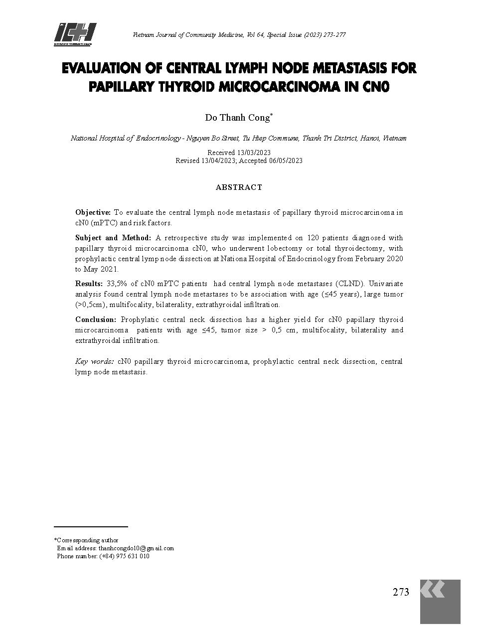 Đánh giá tình trạng di căn hạch trung tâm của vi ung thư tuyến giáp thể nhú CN0 = Evaluation of central lymph node metastasis for papillary thyroid microcarcinoma in CN0