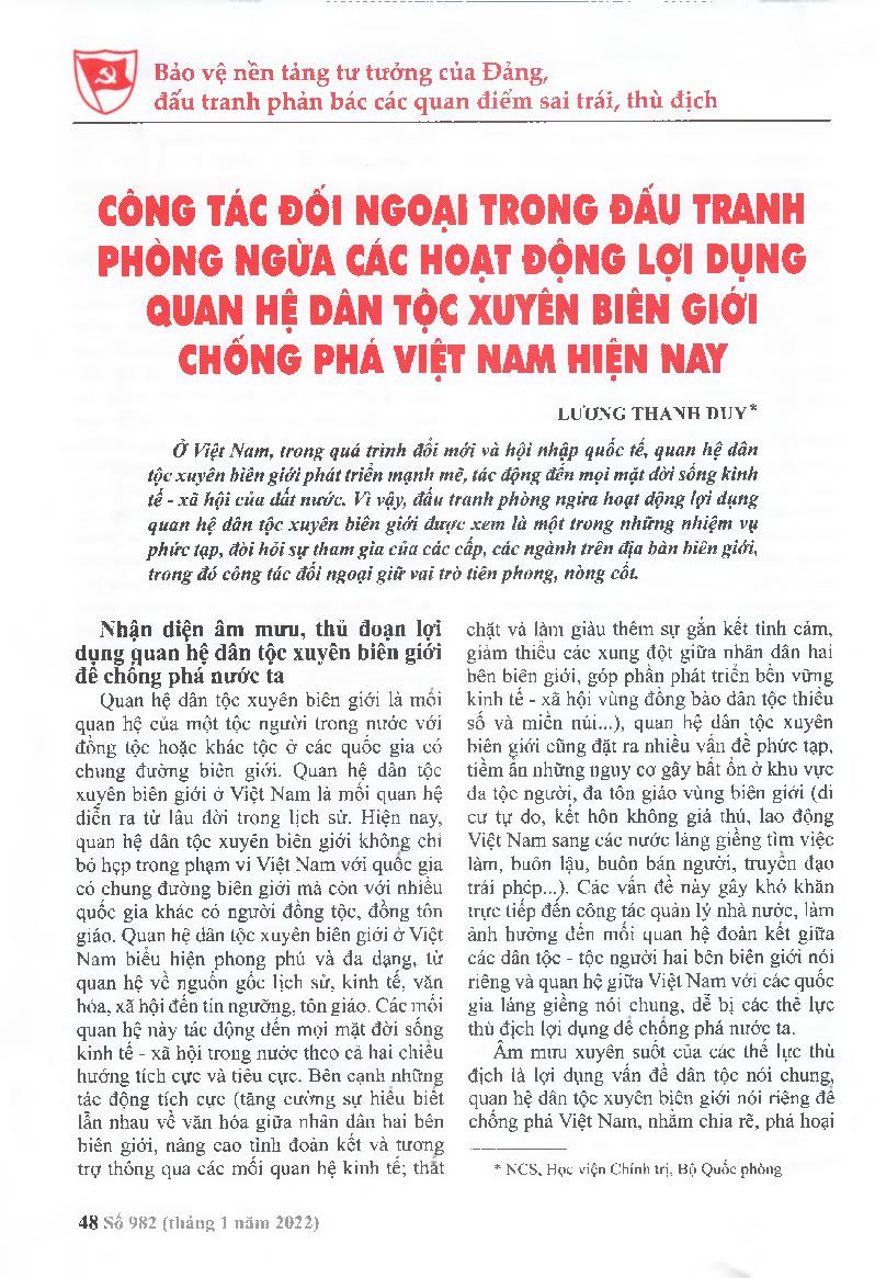Công tác đối ngoại trong đấu tranh phòng ngừa các hoạt động lợi dụng quan hệ dân tộc xuyên biên giới chống phá Việt Nam hiện nay = Foreign affairs in the fight against activities that take advantage of cross-border ethnic relations against Vietnam today
