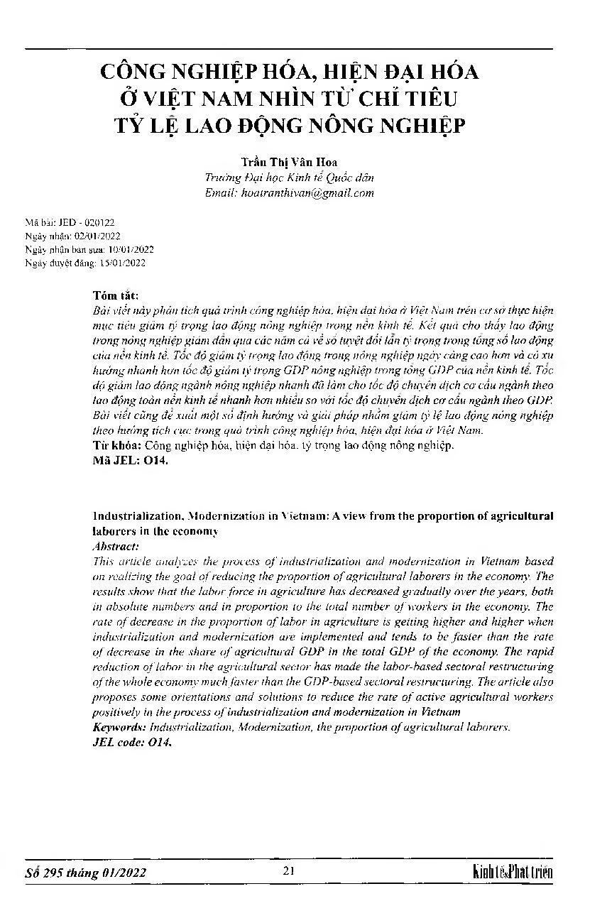 Công nghiệp hóa, hiện đại hóa ở Việt Nam nhìn từ chỉ tiêu tỷ lệ lao động nông nghiệp = Industrialization, .Modernization in Vietnam: A view from the proportion of agricultural laborers in the economy