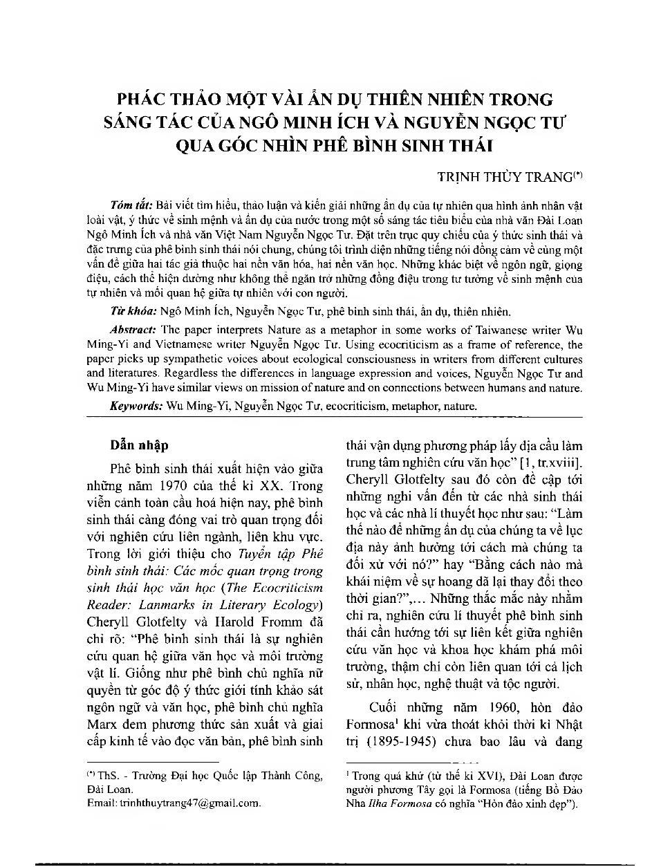 Phác thảo một vài ẩn dụ thiên nhiên trong sáng tác của Ngô Minh Ích và Nguyễn Ngọc Tư qua góc nhìn phê bình sinh thái = Some metaphors of nature in works of Wu Ming-Yi and Nguyen Ngoc Tu from perspectives of ecocriticism