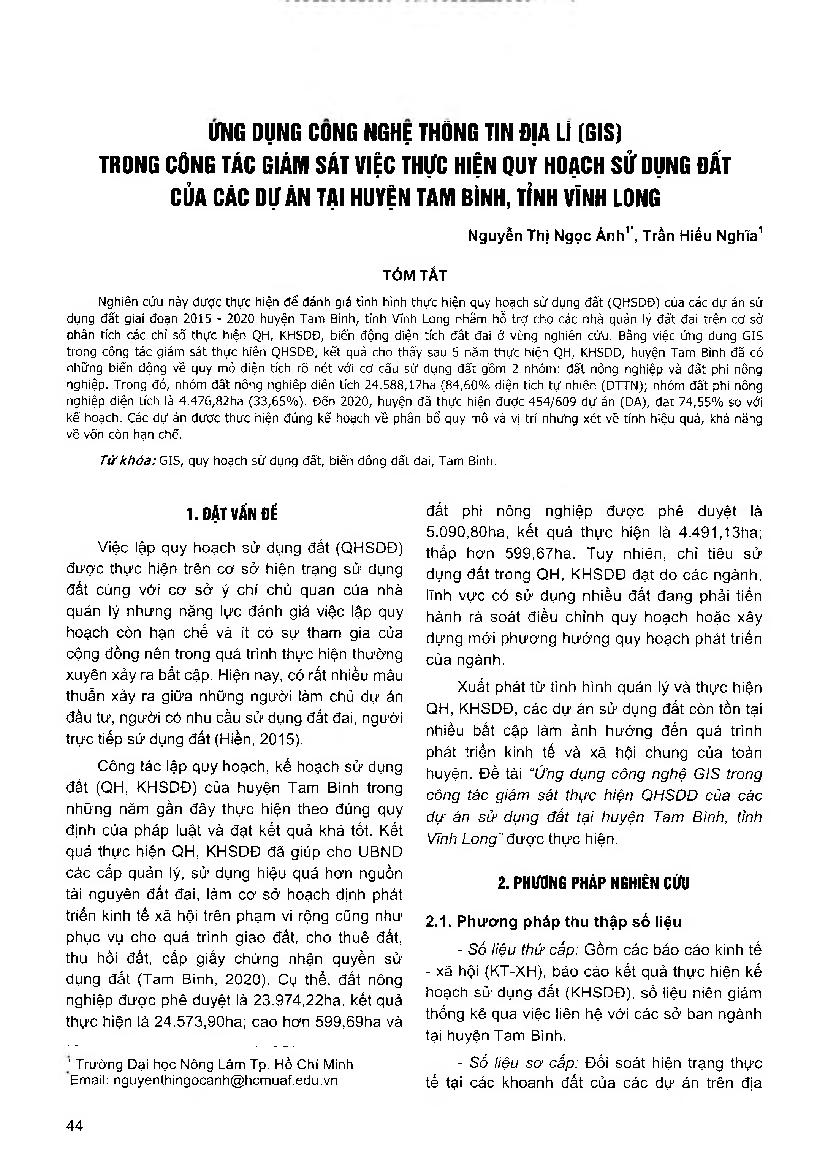 Ứng dụng công nghệ thông tin địa lí (GIS) trong công tác giám sát việc thực hiện quy hoạch sử dụng đất của các dự án tại huyện Tam Bình, tỉnh Vĩnh Long = Application of GIS in supervising the implementation of land use planning projects in Tam Binh distri