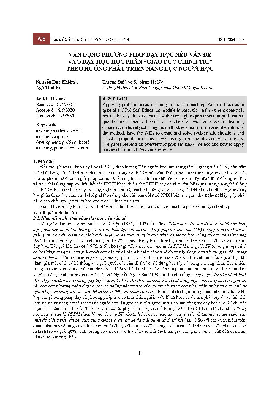 Vận dụng phương pháp dạy học nêu vấn đề vào dạy học học phần “giáo dục chính trị” theo hướng phát triển năng lực người học = Applying problem-raising teaching methods to the "political education" module in the direction of developing learners' competencies