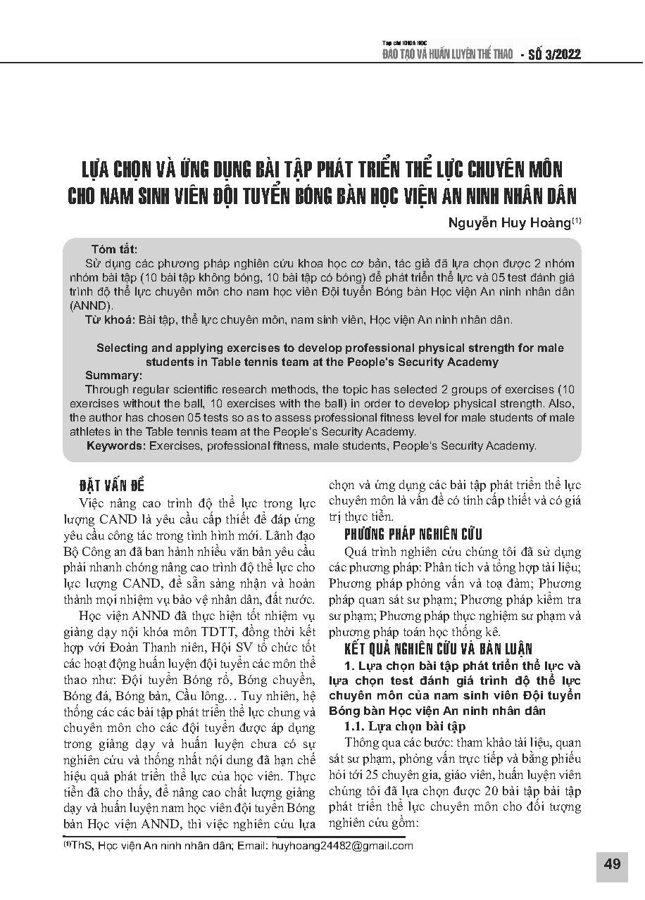 Lựa chọn và ứng dụng bài tập phát triển thể lực chuyên môn cho nam sinh viên Đội tuyển Bóng bàn Học viện An ninh Nhân dân = Selecting and applying exercises to develop professional physical strength for male students in Table tennis team at the People&; 39