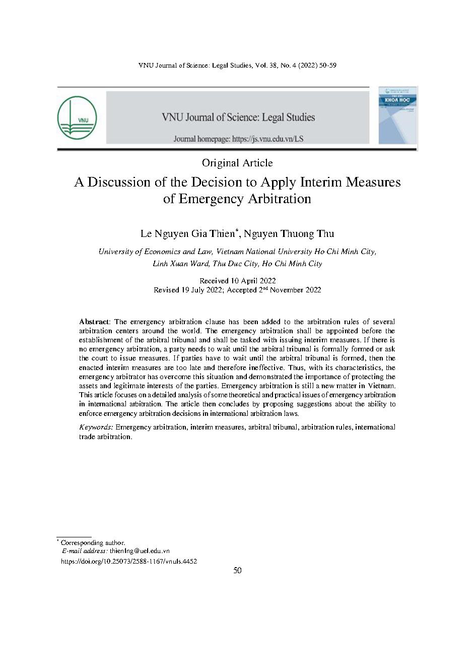 Bàn về quyết định áp dụng biện pháp khẩn cấp tạm thời của trọng tài khẩn cấp = A discussion of the decision to apply interim measures of emergency arbitration