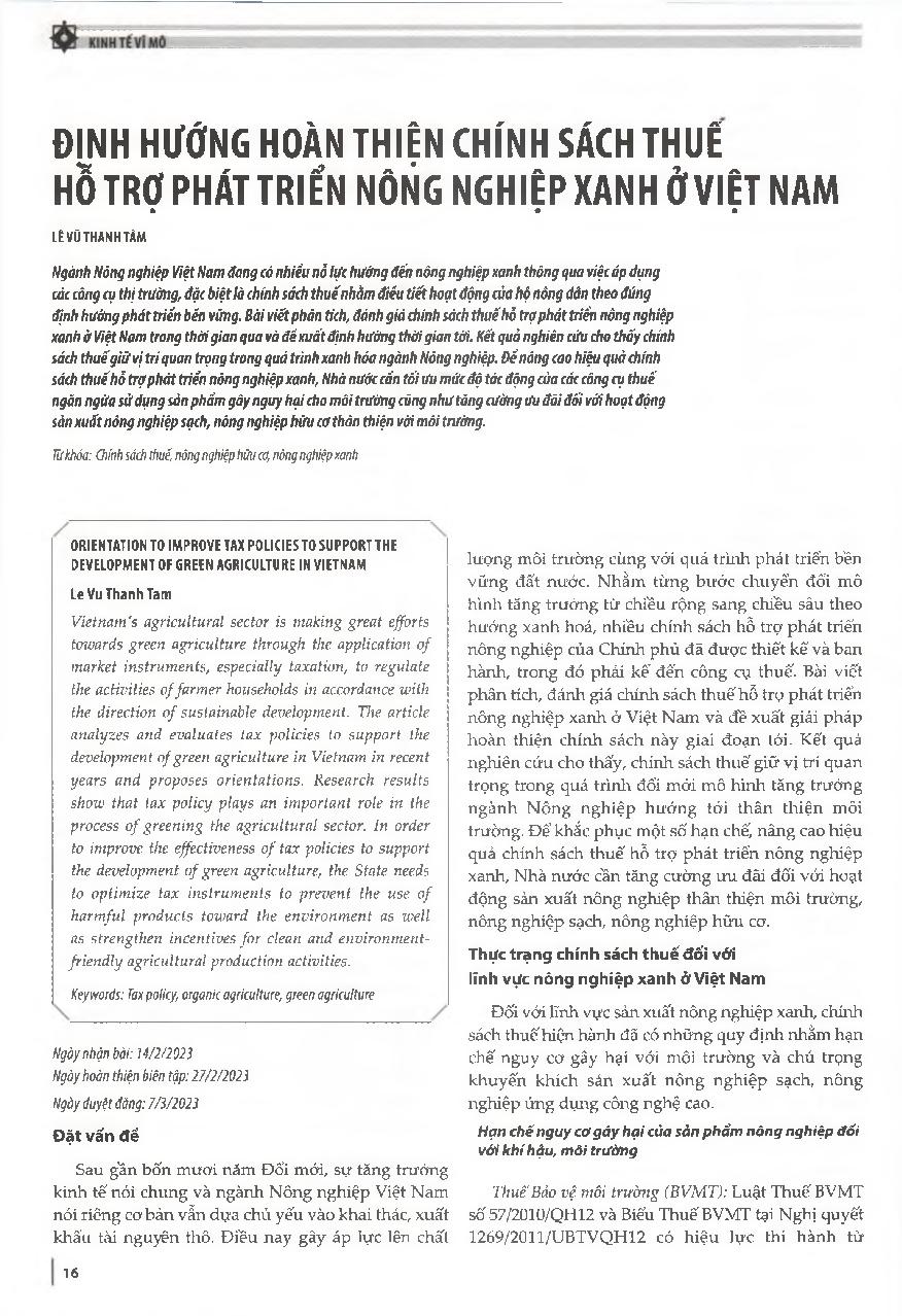 Định hướng hoàn thiện chính sách thuế hỗ trợ phát triển nông nghiệp xanh ở Việt Nam = Orientation to improve tax policies to support the development of green agriculture in Vietnam