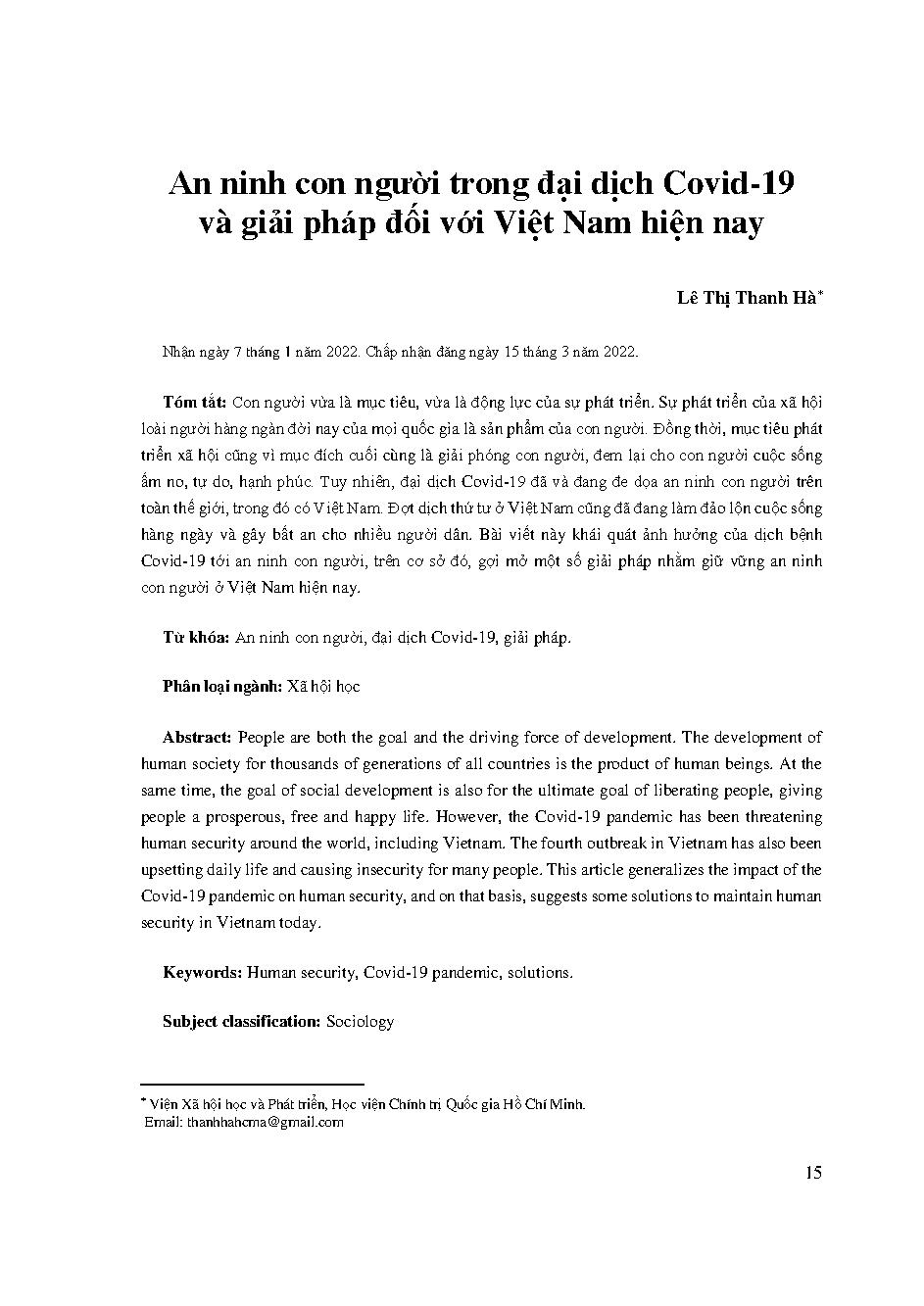 An ninh con người trong đại dịch Covid-19 và giải pháp đối với Việt Nam hiện nay = Human security in Covid -19 and solutions to Vietnam today