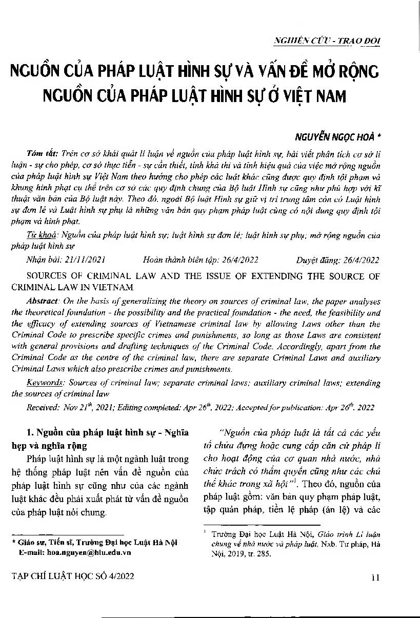 Nguồn của pháp luật hình sự và vấn đề mở rộng nguồn của pháp luật hình sự ở Việt Nam = Sources of criminal law and the issue of extending the source of criminal law in Vietnam