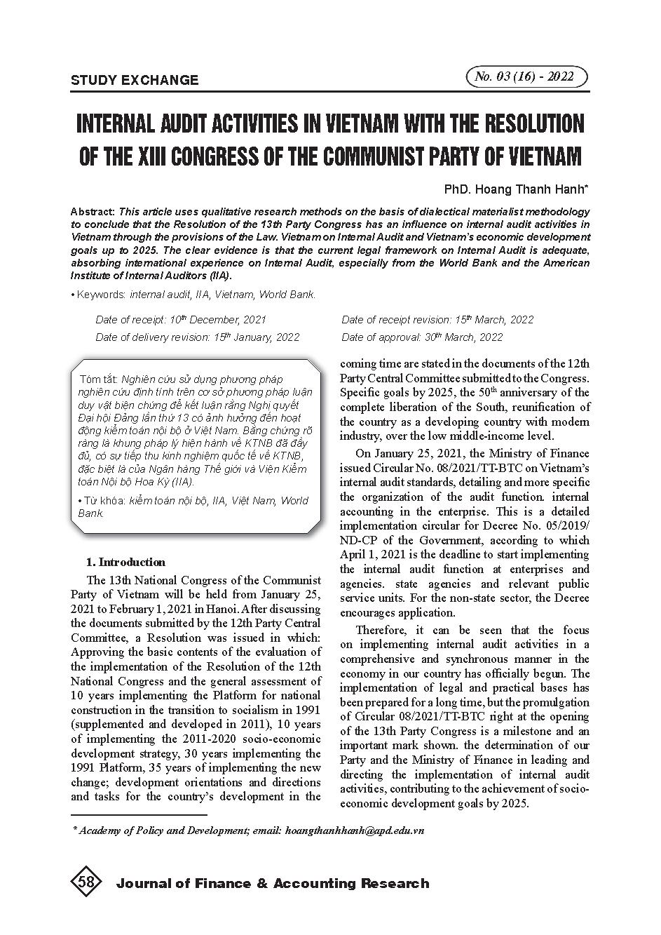 Hoạt động kiểm toán nội bộ tại Việt Nam với Nghị quyết Đại hội Đại biểu toàn quốc lần thứ XIII của Đảng = Internal audit activities in Vietnam with the resolution of the XIII Congress of the Communist Party of Vietnam
