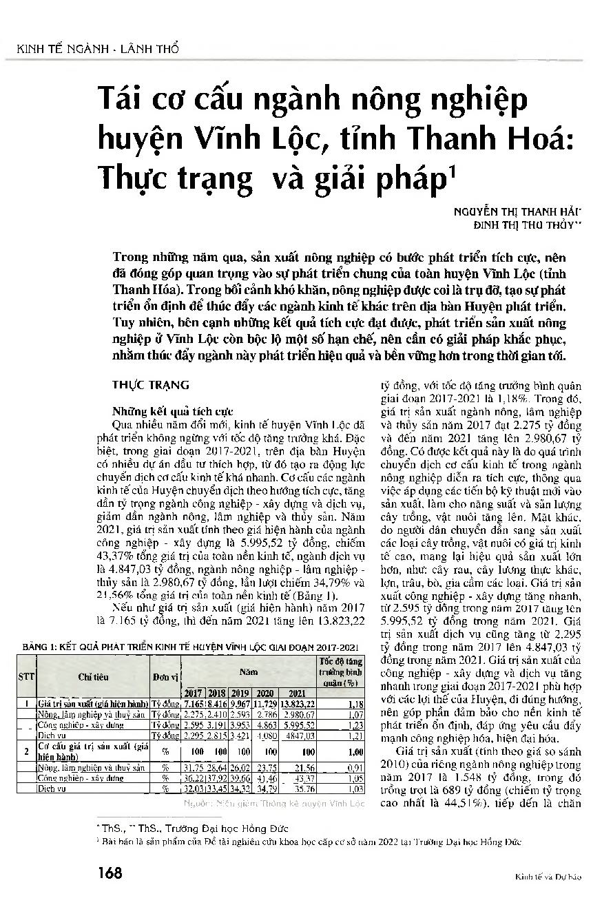 Tái cơ cấu ngành nông nghiệp huyện Vĩnh Lộc, tỉnh Thanh Hoá: Thực trạng và giải pháp