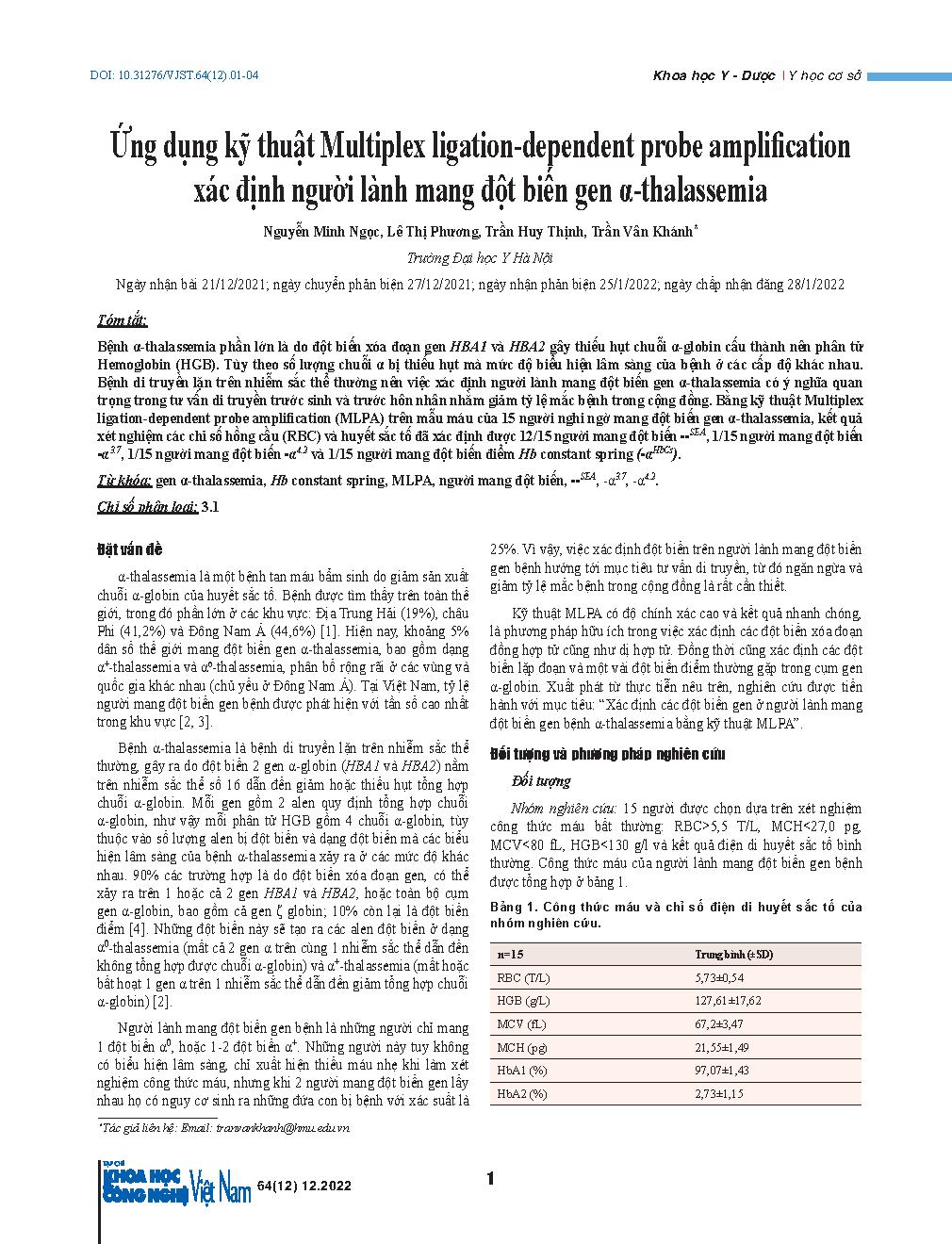 Ứng dụng kỹ thuật Multiplex ligation-dependent probe amplification xác định người lành mang đột biến gen α-thalassemia = Applying Multiplex ligation-dependent probe amplification technique to identify α-thalassemia carriers