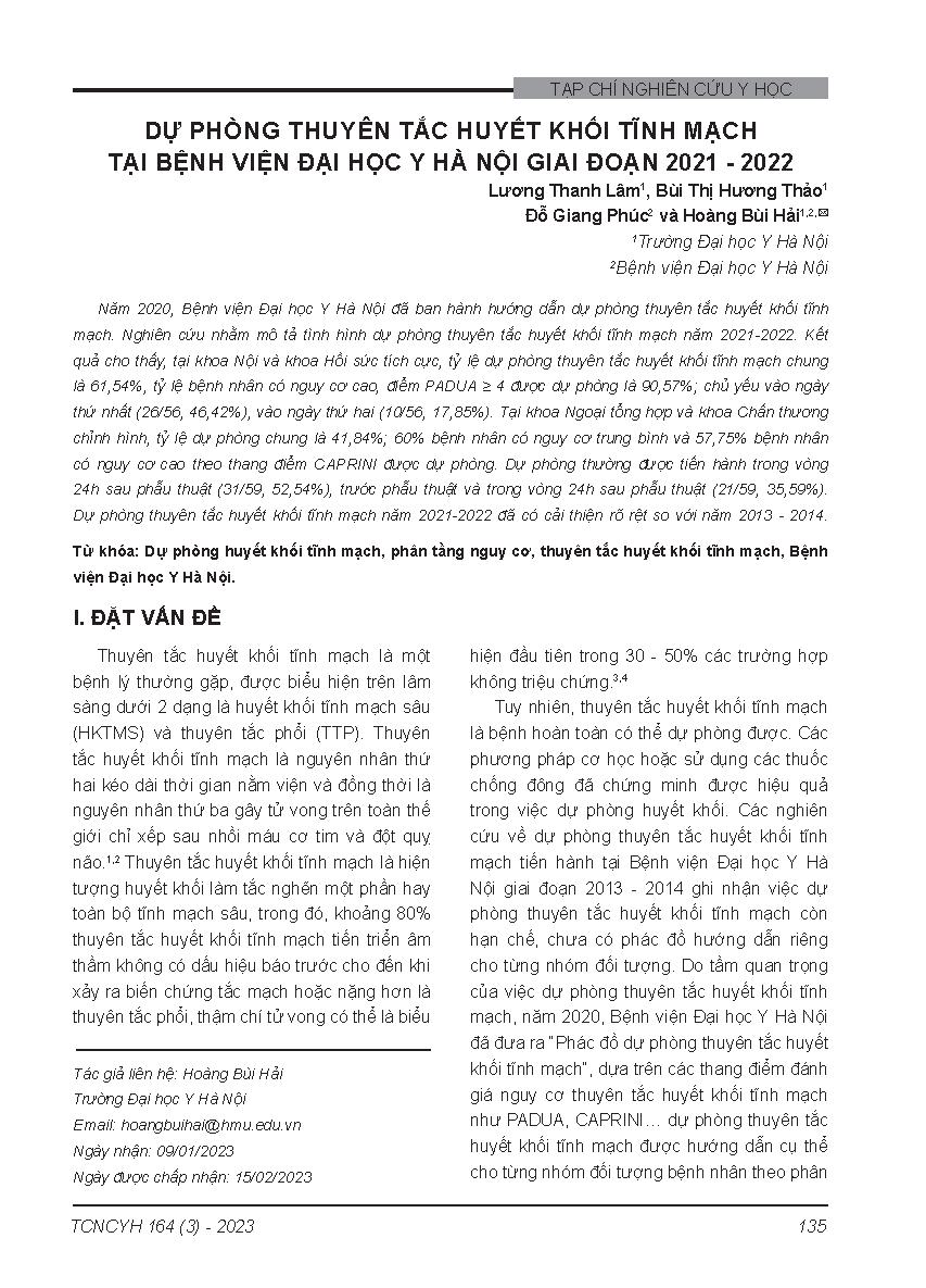 Dự phòng thuyên tắc huyết khối tĩnh mạch tại Bệnh viện Đại học Y Hà Nội giai đoạn 2021 - 2022