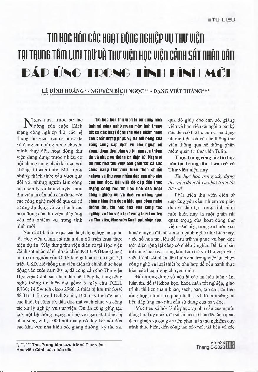 Tin học hóa các hoạt động nghiệp vụ thư viện tại trung tâm lưu trữ và thư viện học viện cảnh sát nhân dân đáp ứng tình hình mới