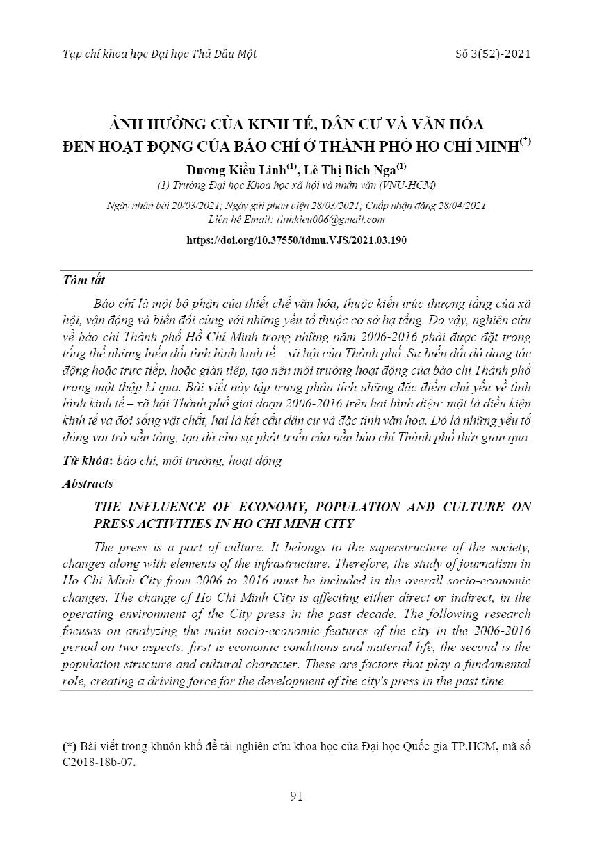 Ảnh hưởng của kinh tế, dân cư và văn hóa đến hoạt động của báo chí ở thành phố Hồ Chí Minh = The influence of economy, population and culture on press activities in Ho Chi Minh city