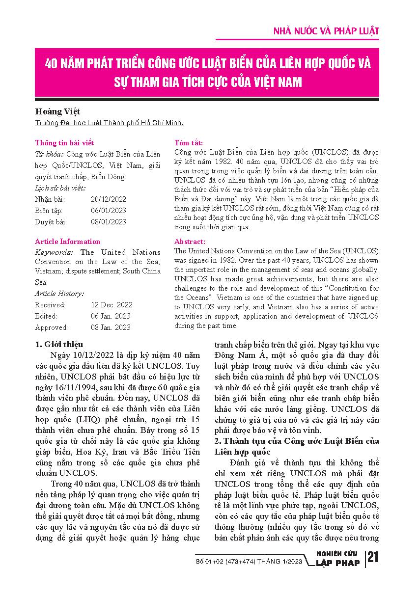 40 năm phát triển Công ước Luật biển của Liên hợp quốc và sự tham gia tích cực của Việt Nam = 40 years of development of the United Nations Convention on the Law of the Sea and Vietnam's active participation