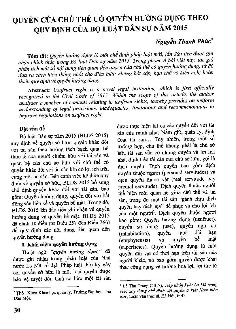Quyền của chủ thể có quyền hưởng dụng theo quy định của Bộ luật Dân sự năm 2015 = On Usufruct Rights under the Civil Code of 2015