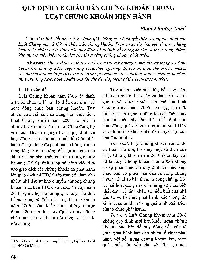 Quy định vè chào bán chứng khoán trong Luật Chứng khoán hiện hành = Regulations on Offer of Securitiesunder the Securities Law
